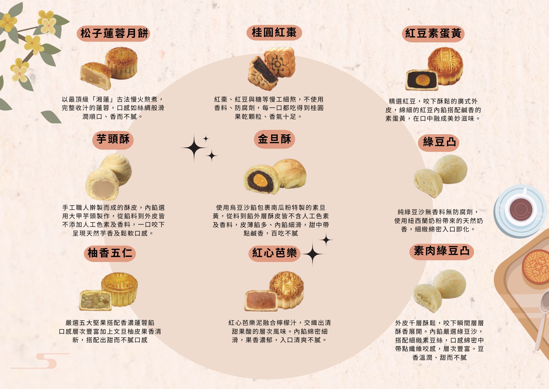 秉持真誠良善的心意,優先使用友善耕作的食材,來呈現自然的真實安心食品味道,月餅開發也是同樣的原則。修飾澱粉、動物油脂等,改採無添加改良劑的麵粉、無農藥殘留的原料、無香料豆沙、非保濕油脂,並注意減少烘焙油用量